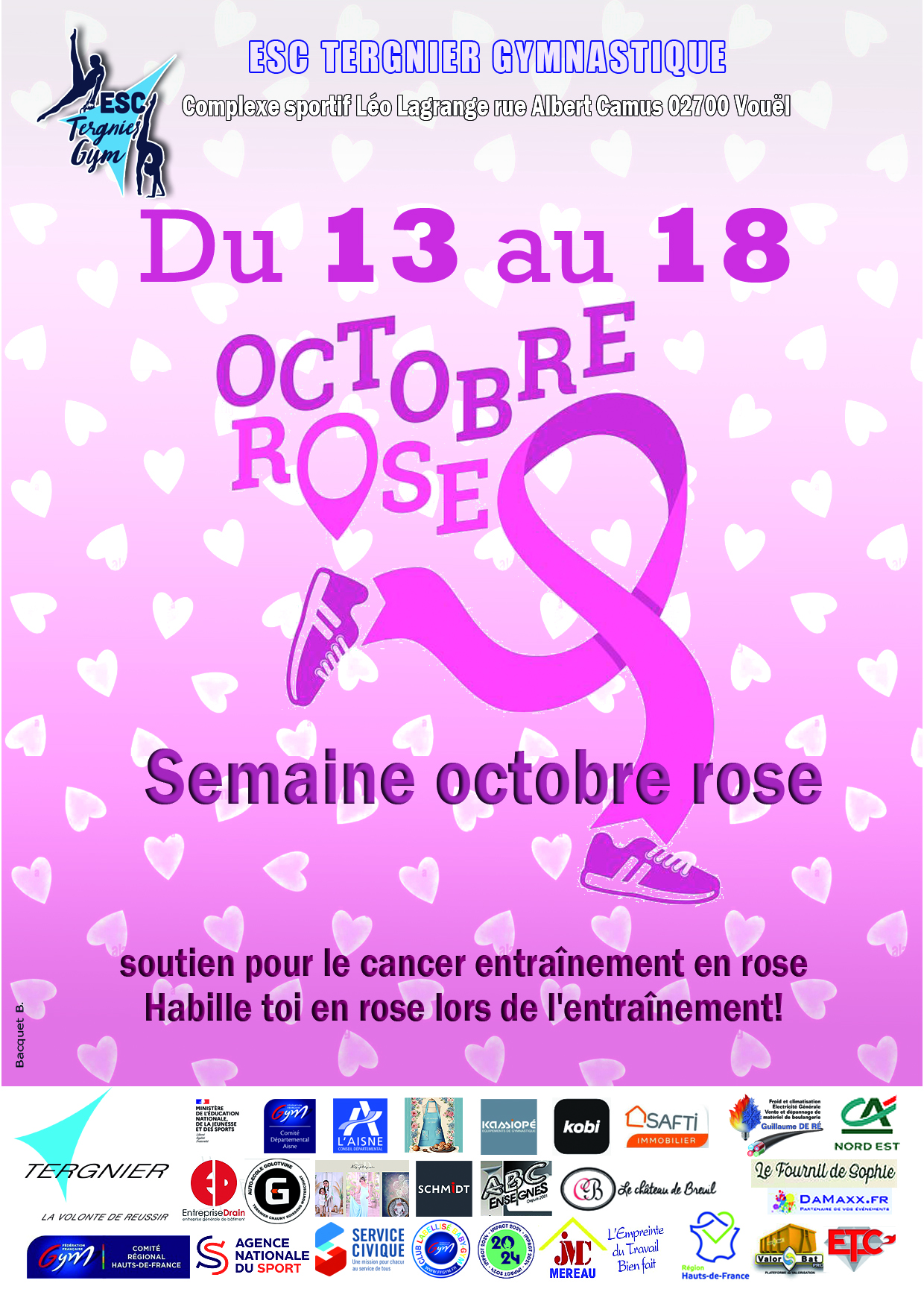 Tout au long de cette semaine, nous invitons tous les enfants à venir habillés en rose lors de leurs entraînements. Ce petit geste symbolique nous permettra de réaliser de jolies photos souvenirs, mais surtout de montrer que, même à notre échelle, nous pouvons participer à cette grande cause.